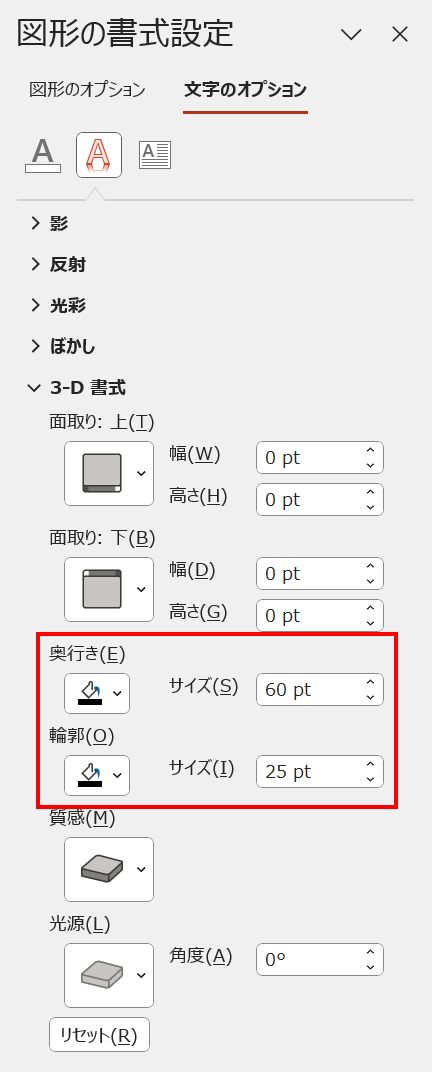 作例は、[文字のオプション]→[文字の効果]→「3-D書式」の値を「奥行き:60pt」「輪郭:25pt」に設定しています。