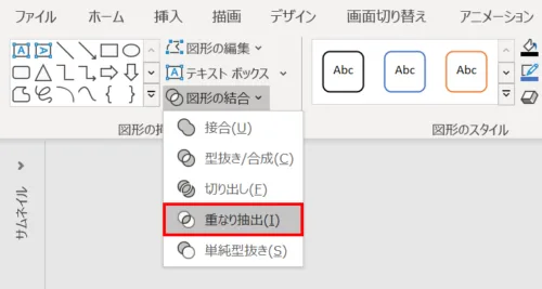 「Shift」キーを押しながら「背面の図形」→「前面の図形」の順に選択し、「図形の書式」タブ →「図形の挿入」グループ →「図形の結合」→「重なり抽出」をクリックします。