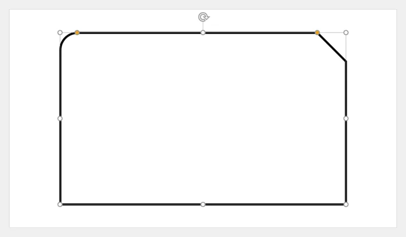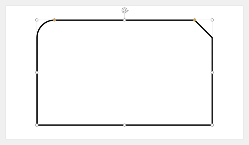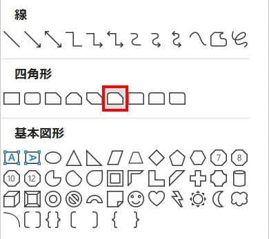 「ホーム」タブ →「図形描画」→「四角形:1つの角を切り取り1つの角を丸める」を選択します。