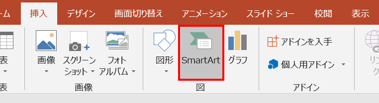 「挿入」タブ →「図」グループ →「SmartArt」をクリックします。