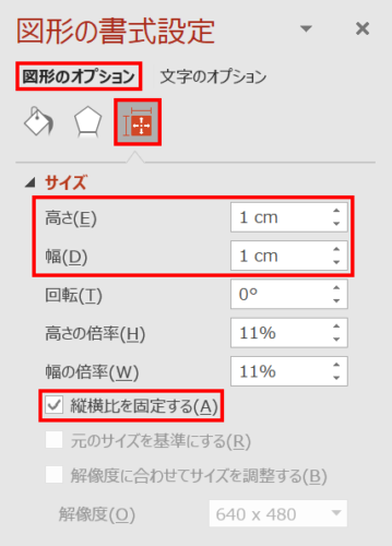 「図形の書式設定」ウィンドウ →「図形のオプション」→「サイズとプロパティ」→「サイズ」の「縦横比を固定する」にチェックを入れ、「高さ」または「幅」の値を変更します。
