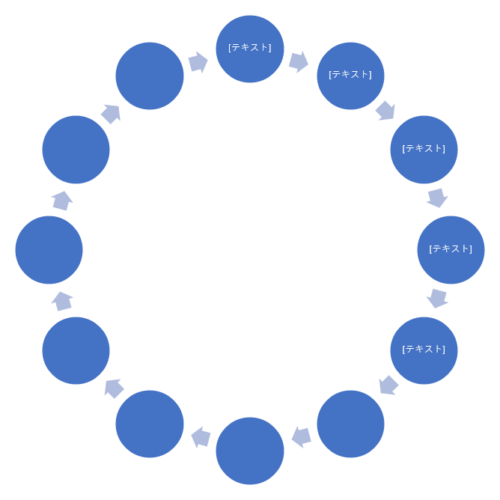SmartArtがスライドに挿入されます。今回は、星が12個円周上に配置した図形を作りたいので、現在5個ある正円の数を7個増やします。