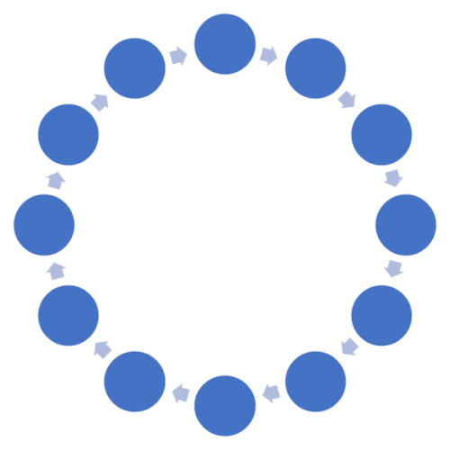 図形を円周上に配置するときは、複製と回転の繰り返しでできますが効率的ではありません。PowerPointには自動で図形を円周上に並べてくれるツールがあるので活用しましょう。