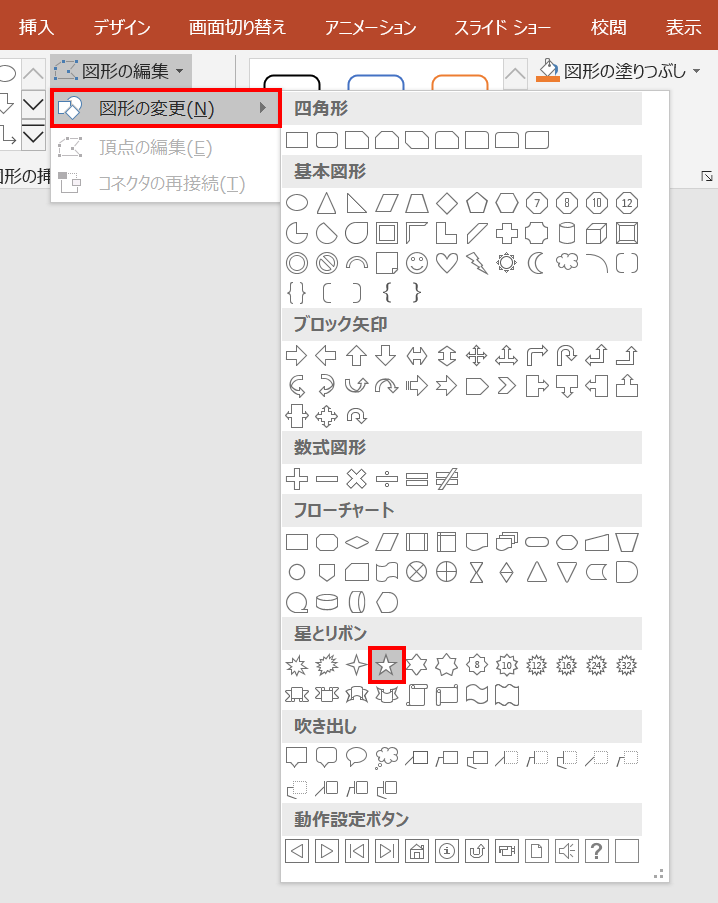 すべての正円を選択し、「図形の書式」タブ →「図形の挿入」グループ →「図形の編集」→「図形の変更」→「星:5pt」を選択します。