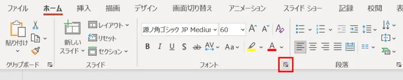テキストボックスを選択した状態で「ホーム」タブ →「フォント」グループ → 右下の矢印をクリックします。