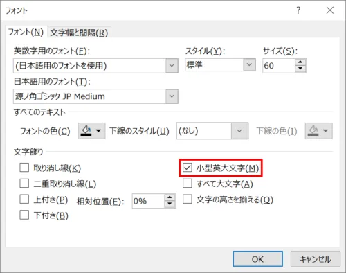 「フォント」ダイアログボックスが開くので「小型英大文字」にチェックを入れ、「OK」をクリックします。